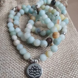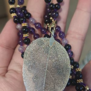 Elle est apaisante, calme le stress et aide à l’endormissement. Elle aide à l’introspection pour dissiper les colères. C’est une pierre bénéfique pour le mental, qui permet l’équilibre et la sérénité. Elle a une particularité très surprenante : sa vibration agirait sur les ondes Bêta (éveil, activité physique et intellectuelle) permettant de passer en ondes Alpha (détente, méditation, relaxation). Ce collier est accompagné de Grenat rouge (almandin). C’est une pierre d’ancrage assez puissante ; elle nous aide à combattre le découragement et la tristesse.