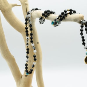 Il est déconseillé de porter son bijou en pierres naturelles pour : dormir, faire du sport, se baigner, sous la douche ou si vous allez beaucoup transpirer. Lorsque le collier n’est pas porté, ne pas le laisser au soleil ou au contact de l’humidité. Préférez le rangement dans une boite à bijoux ou un pochon à l’abri.