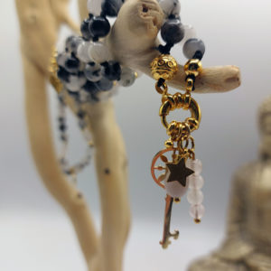 Il sera accompagné d’une breloque demi lune. Il portera un fermoir mousqueton, anneau doré (sans nickel).